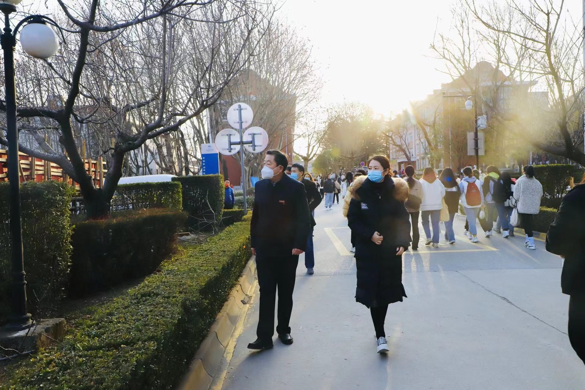 为保障新学期教学工作平稳运行,2022年2月28日,在副校长齐玉水和教务处处长秦晓梅的带领下,全体教务处工作人员,分小组对全校开学首日教学运行情况进行了检查。检查期间,齐玉水对各二学院教学准备工作、课堂教学情况、学生注册报到情况、毕业生到校情况和实习准备情况进行了详细询问。