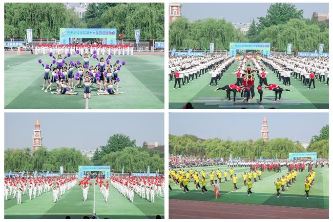 随后大型团体操表演如期呈现。西北武术院龙狮队的《舞龙舞狮》将气氛推向高潮。省武术队、西安体育学院武术队与我校120名学生带来的《西译武魂》,昭示着我校师生披荆斩棘、奋发图强的精神力量。校瑜伽代表队及各学院学生代表采用行云流水、刚柔并济一系列高难度肢体语言演绎的《梦九儿》,展现出西译学子团结协作、攻坚克难的优良品德。校啦啦操代表队及各院系学生代表通过活力四射的《离开浪浪山》,诠释出西译良好的育人氛围。由各院系学生代表带来的团体操《早安,阳光》,尽显当代青年积极向上的生活及学习态度,他们手捧象征青年学子不畏困难、勇于探索的双色星标,展示了西译学子秉持“读书、做人、变革、奋进”的校训,将西译精神代代传承的决心。积力所举无不胜、众智所为无不成。节目表演尾声,全体参演人员热情舞动双手,汇聚操场中央,彰显出西译人团结奋斗的强大力量。