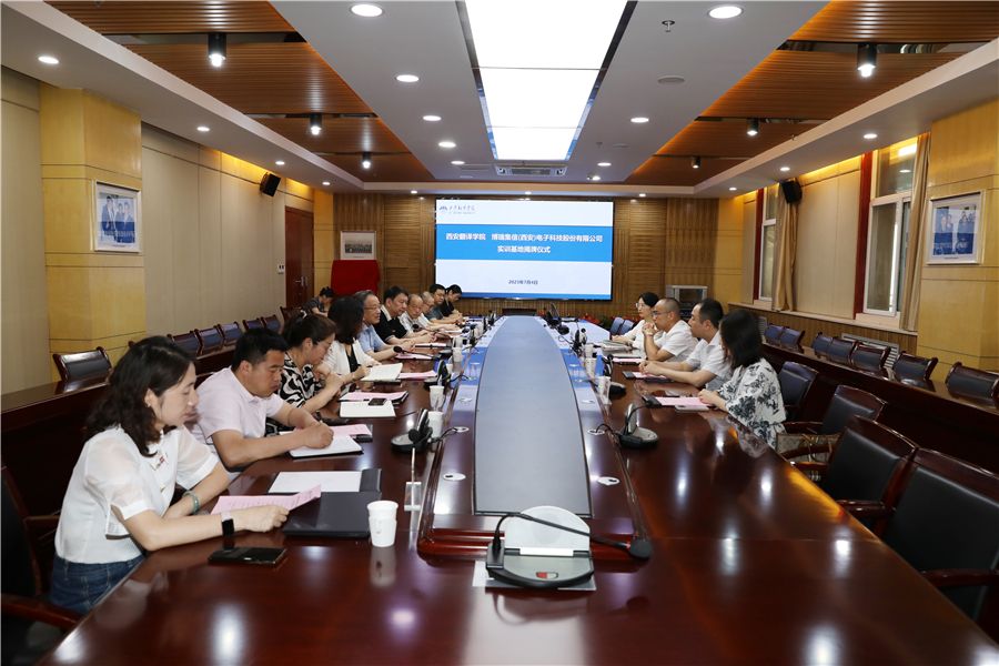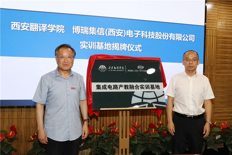 7月4日,西安翻译学院与博瑞集信(西安)电子科技股份有限公司实训基地揭牌仪式在西译举行。博瑞集信(西安)电子科技股份有限公司理事长、总经理张博与西安翻译学院校长崔智林共同为集成电路产教融合实训基地揭牌。副校长王霖、信息工程学院院长葛海波等领导出席活动。副校长王利晓主持揭牌仪式。